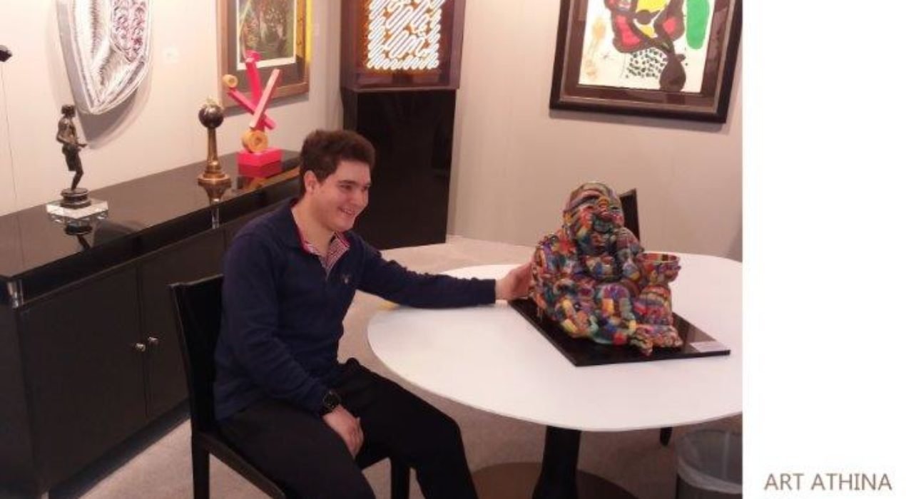 Nikiforos Michalaras with his sculpture of Happy Buddha at the Mihalarias – Art booth for Art Athina 2017 exhibition held at the TaeKwonDo Stadium in Palaio Faliro.
